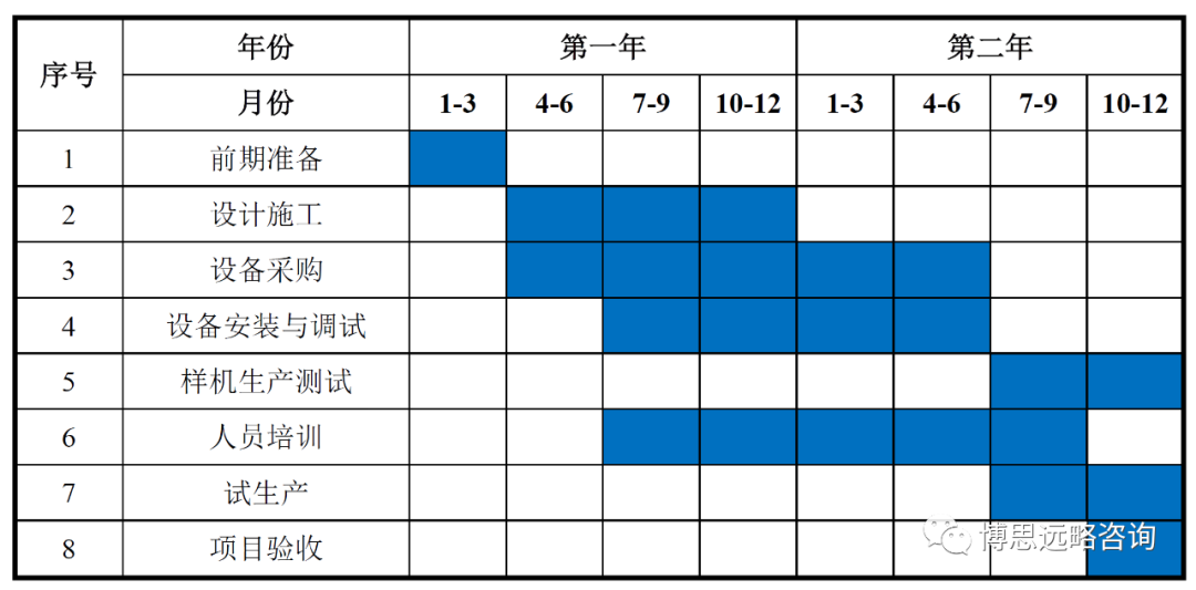 本项目预计24 个月建设实施完成,分为前期准备、设计施工、设备采购、设备安装与调试、样机生产测试、人员培训、试运行、项目验收等各阶段。各阶段具体实施进度的计划如下表: