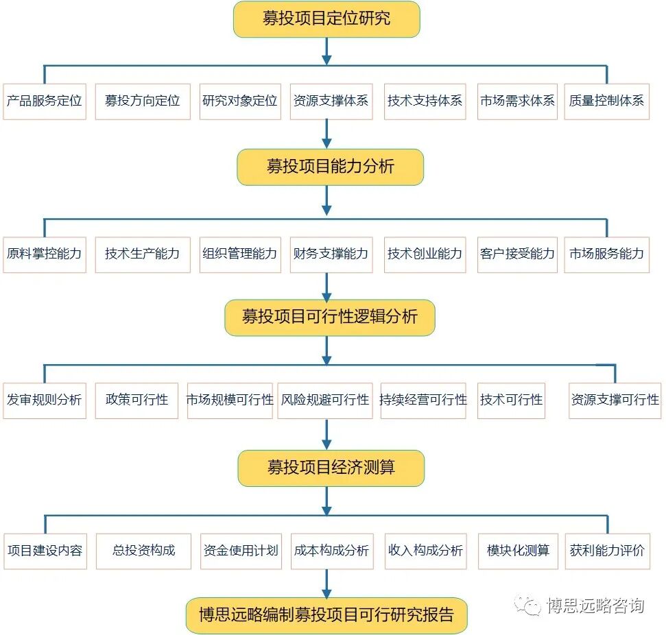 博思远略在实际工作中严格按照证监会及交易所的审核流程展开各项工作,首先确定募集资金总额及各个项目总投资、建设内容等关键指标数据,完成备案核准版可研报告或者申请报告撰写,上报获取批文。同期根据项目环境影响到环保局办理环评审查;然后,根据券商招股书需要,详细撰写项目投资建设的必要性、可行性、政策背景、优势、科技创新、市场容量分析、营销推广策略、设备选型表、投资构成描述、效益成本分析等部分。