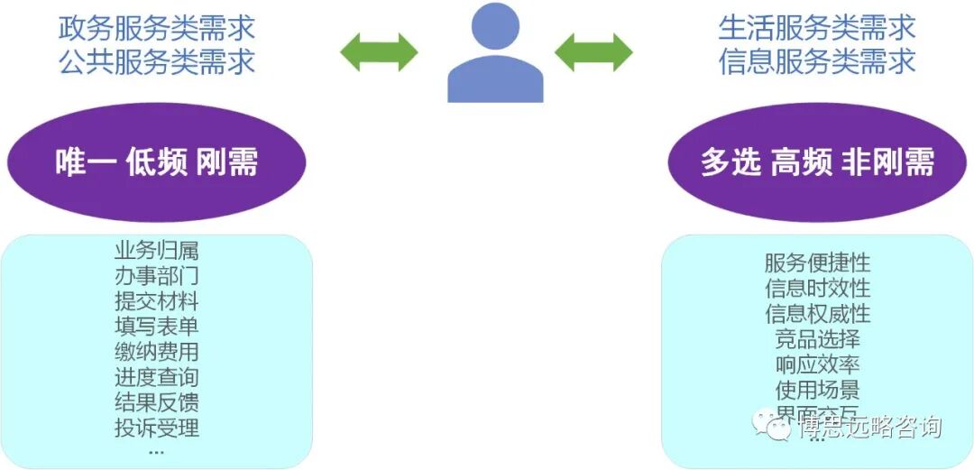 为了避免重复建设,我国各地按照要求建设统一的移动政务服务平台(省市级),全面汇聚政务服务、公共服务和便民服务资源,构建城市服务生态体系,让百姓用一个APP就可以畅享城市服务。在此背景下,政务APP用户的需求可以划分为两大类,如下图所示: