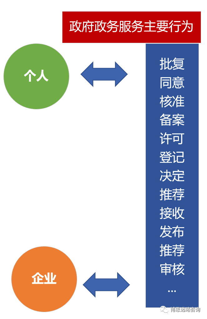 上图是政府在提供政府服务于用户交互过程中常见的行为,在具体的体验设计过程中将具体行为背后政府部门直接的协同进行封装,设计统计接口(事项)与用户对接,对用户需求与办事流程进行优化重组。